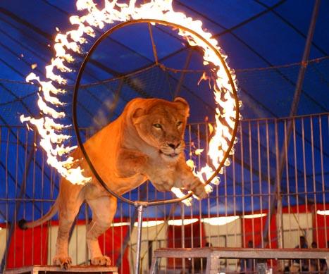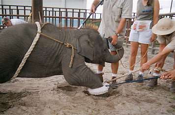 At the Ringling Bros. circus, a baby elephant is wrestled down using ropes, sharp hooks, and electroprods; part of standard elephant training is to break their spirits.