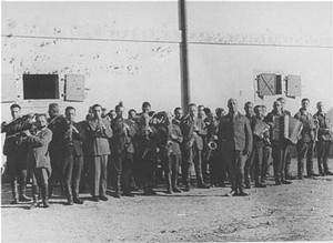 Members of the Janowska concentration camp orchestra perform in front of the barracks.