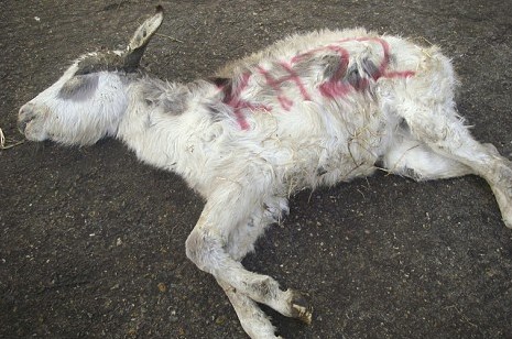 A donkey is left to starve by a neglectful farmer; comparable to "Walking Skeletons" image used in PETA's Holocaust on Your Plate exhibit.