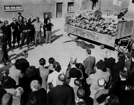 Allied soldiers have German citizens see starved remains of concentration camp victims