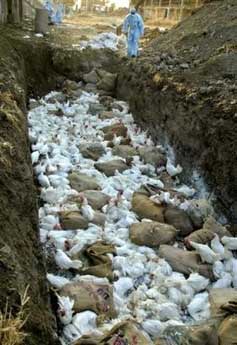 Chickens in India are killed because it is suspected they might carry H1N1; this point comparable to PETA's Holocaust on Your Plate exhibit slide, "The Final Indignity," which shows two piles of corpses: pigs and Holocaust victims.