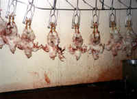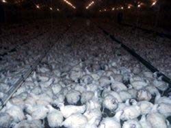 "Broiler" chickens in a vast facility; comparable to "Mass Murder" slide in PETA's Holocaust on Your Plate exhibit--a parallel comment often made whatever one happens to think of the "murder" charge.