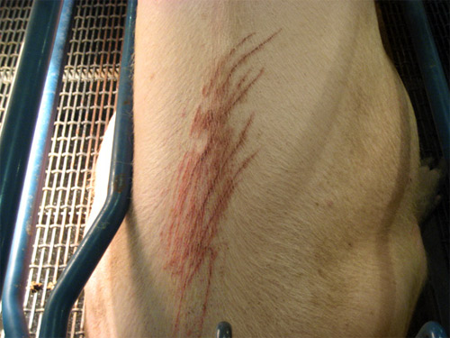 Pigs do not like to be moved forcibly; they are often "herded" by being beaten with gate rods; this sow's back shows the aftermath of such cruel treatment; this parallel comparable to PETA's Holocaust on Your Plate exhibit, namely the slide called "The Road to Hell" showing herding of Jews compared to herding of cows.